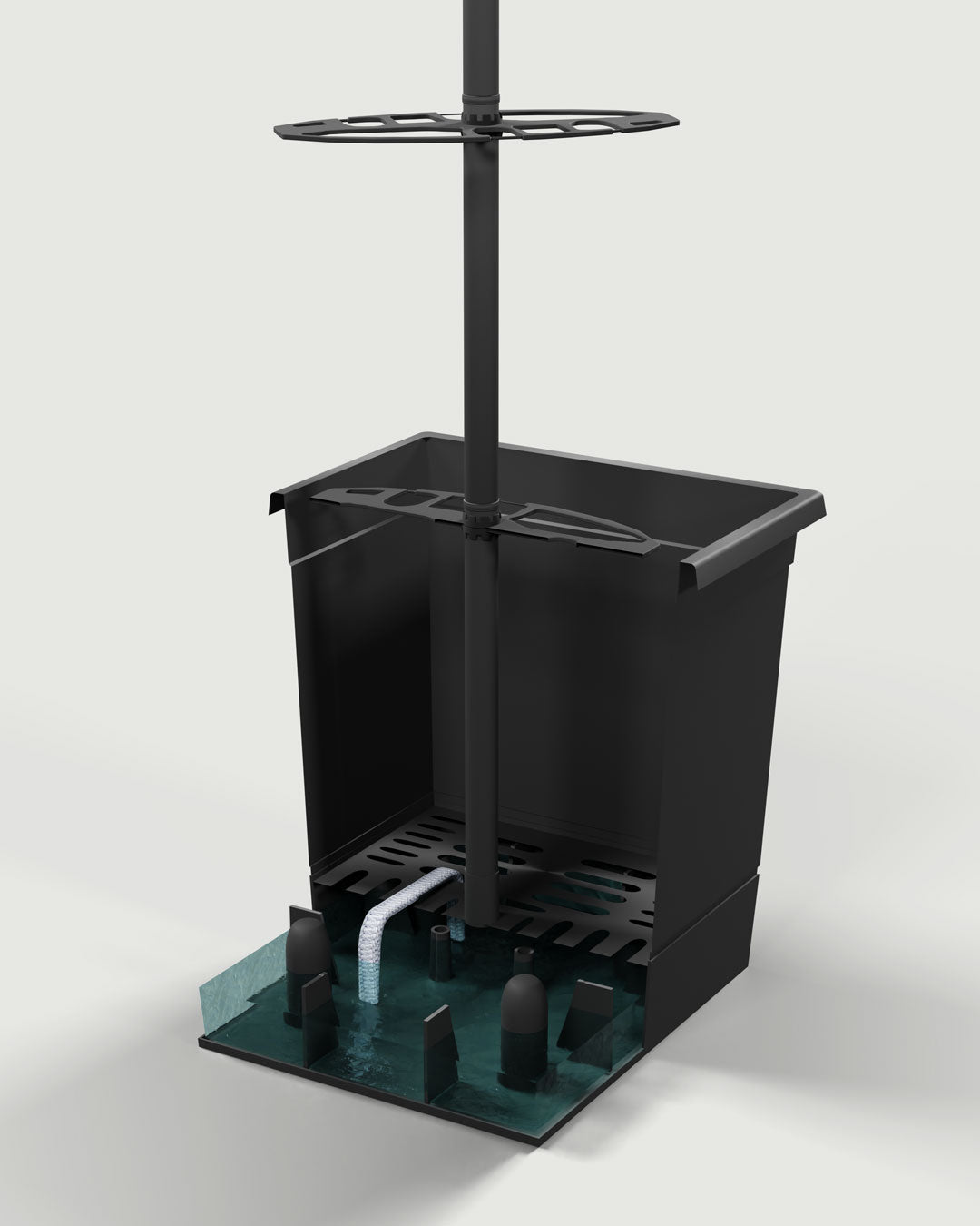 Der Speicher fasst 3,5l und lässt sich durch die runde Gießöffnung an der Seite befüllen. Er ist die Grundlage für die Bewässerungsdochte.