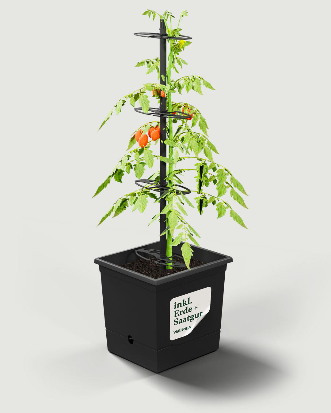 In unserem Starter-Set erhältst du neben dem Tomaten Pflanztopf torffreie Kokoserde und Bio Tomatensaatgut Roma.