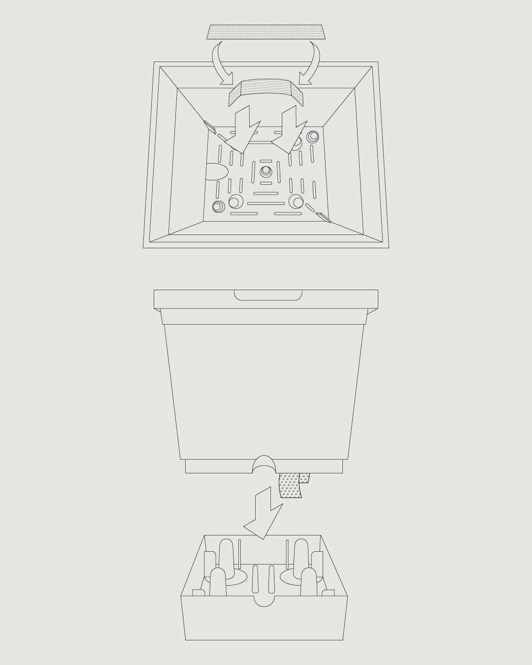 Forme den Bewässerungsdocht U-förmig und schiebe ihn durch die Öffnungen an der Unterseite des Topfes. Stelle den Pflanztopf anschließend auf den Wasserspeicher.