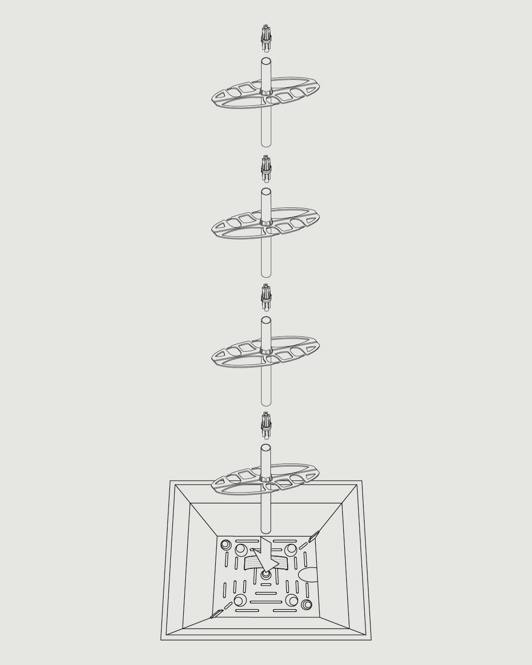 Stecke die modularen Stabelemente, Verbinder und Pflanzenhalter wie auf der Abbildung zusammen. Beginne dabei mit der Fixierung des untersten Stabelementes in der Mitte des Topfbodens.