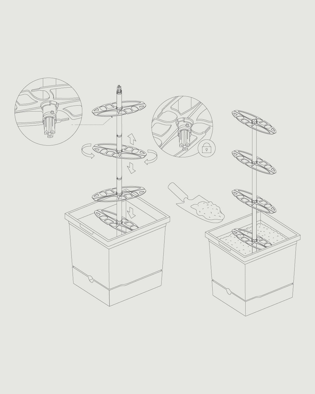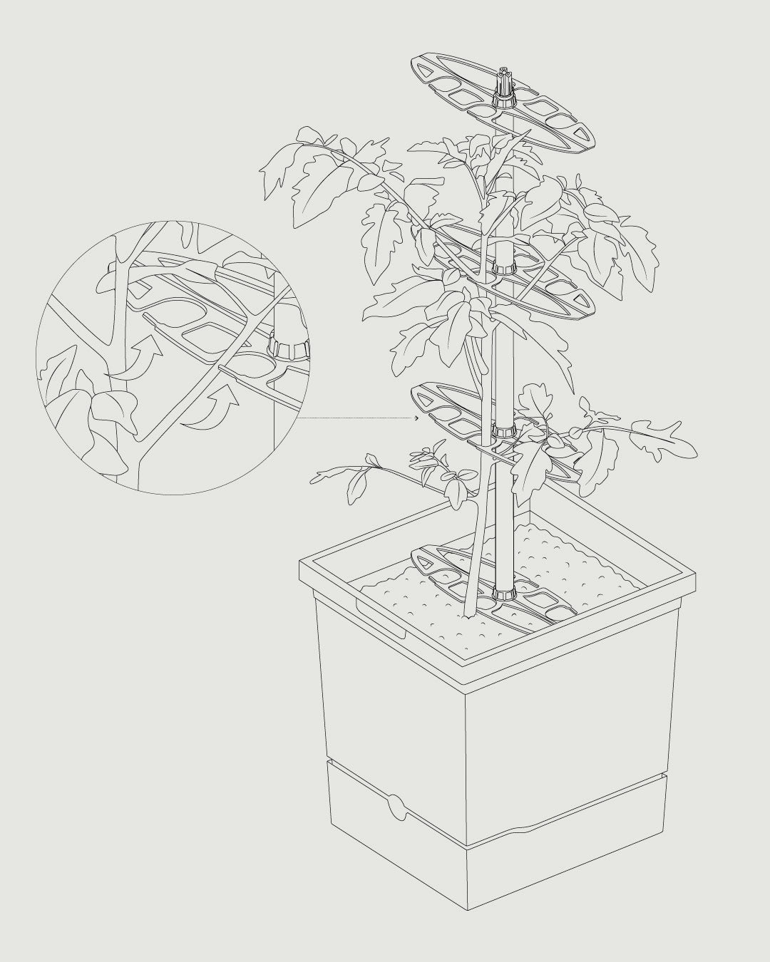 Setze die Pflanze vor dem untersten Pflanzenhalter im Topf ein. Die Triebe und Früchte können gemäß dem Pflanzenwachstum in den vier Clips des jeweiligen Pflanzenhalters befestigt werden.