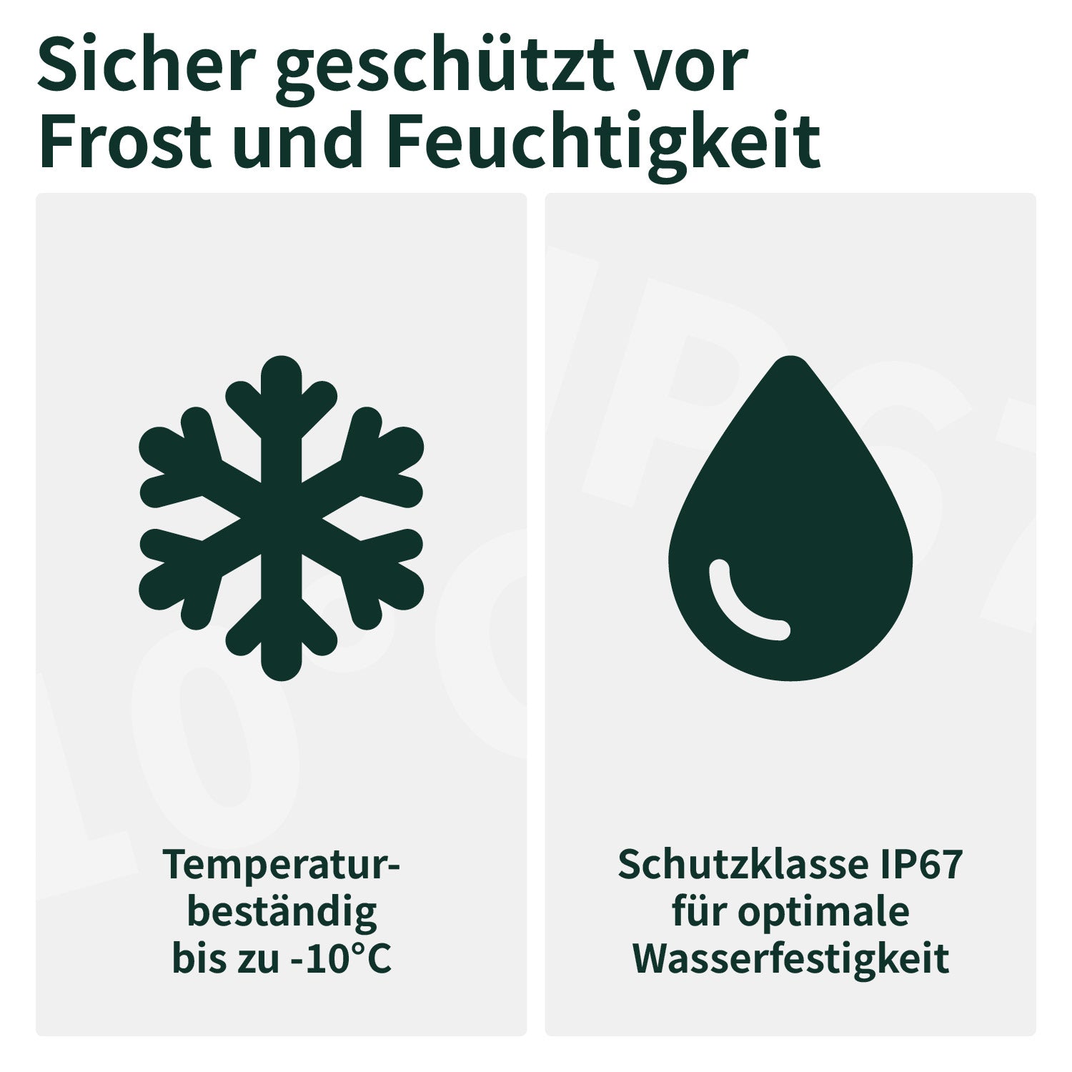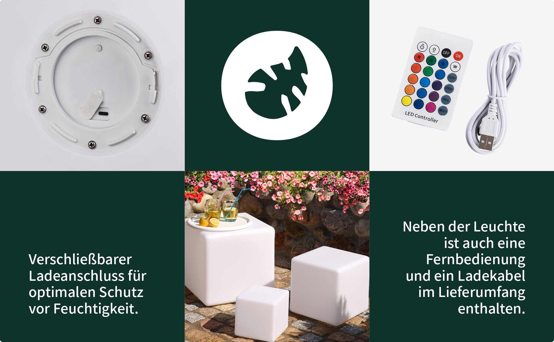 Neben der Ästhetik punktet unser LED Leuchtwürfel ebenso mit Langlebigkeit. Temperaturen von bis zu -10°C sind für ihn kein Problem und die Wasserfestigkeit macht ihn auch bei Regen zu einem echten Hingucker.