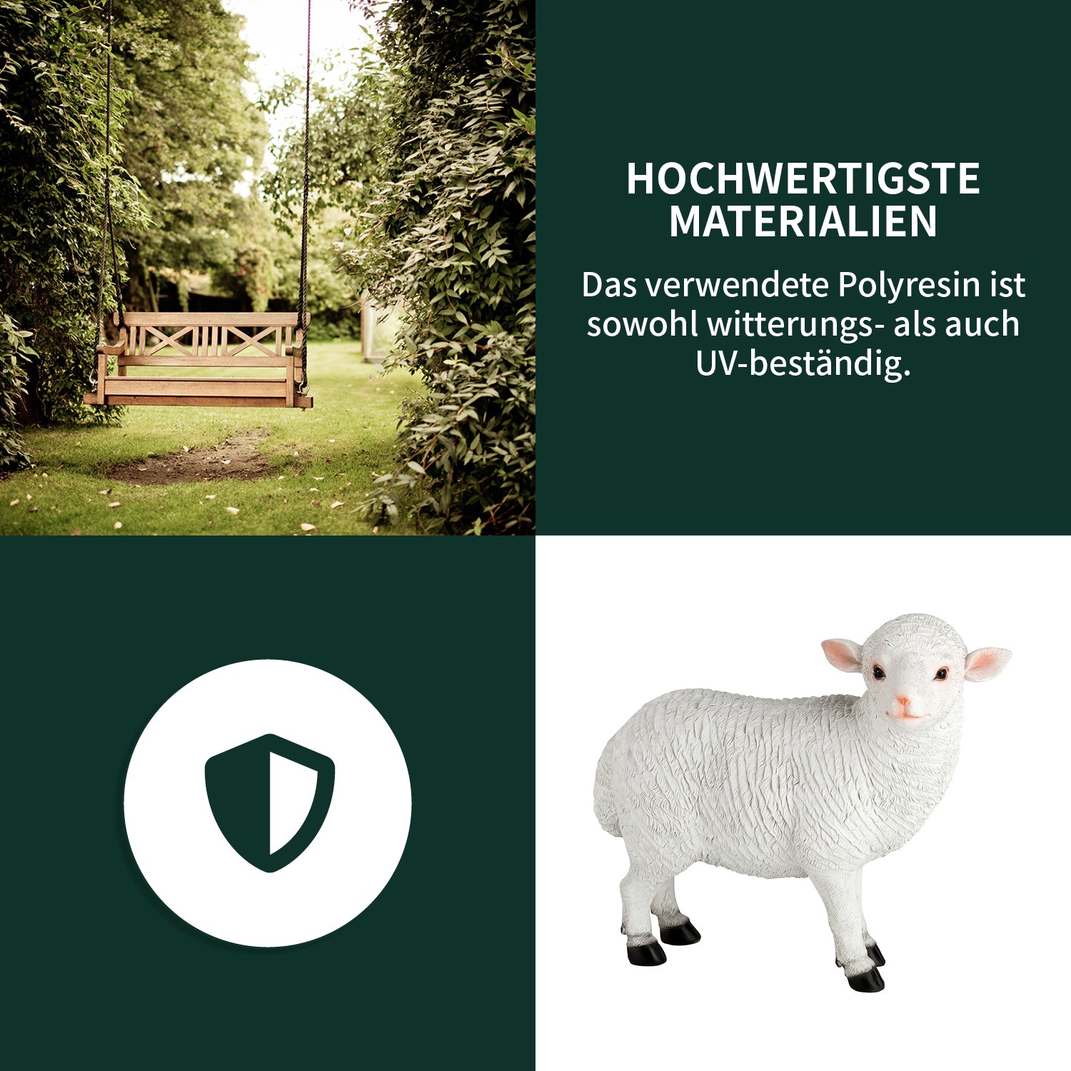 Das robuste Polyresin (Kunstharz) sorgt dafür, dass die Figuren widerstandsfähig gegenüber äußeren Einflüssen sind. Sie halten Wind und Wetter, Frost und Sonnenstrahlen stand.